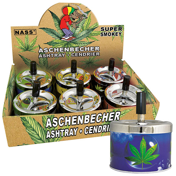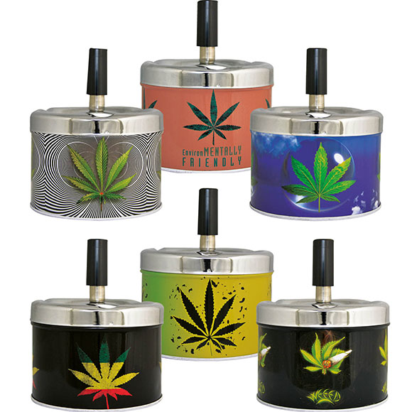 Draaibare asbak met drukmechanisme met 5 verschillende Rasta-motieven in een display van 6 stuks. De zwarte asbak wordt 2 keer geleverd.