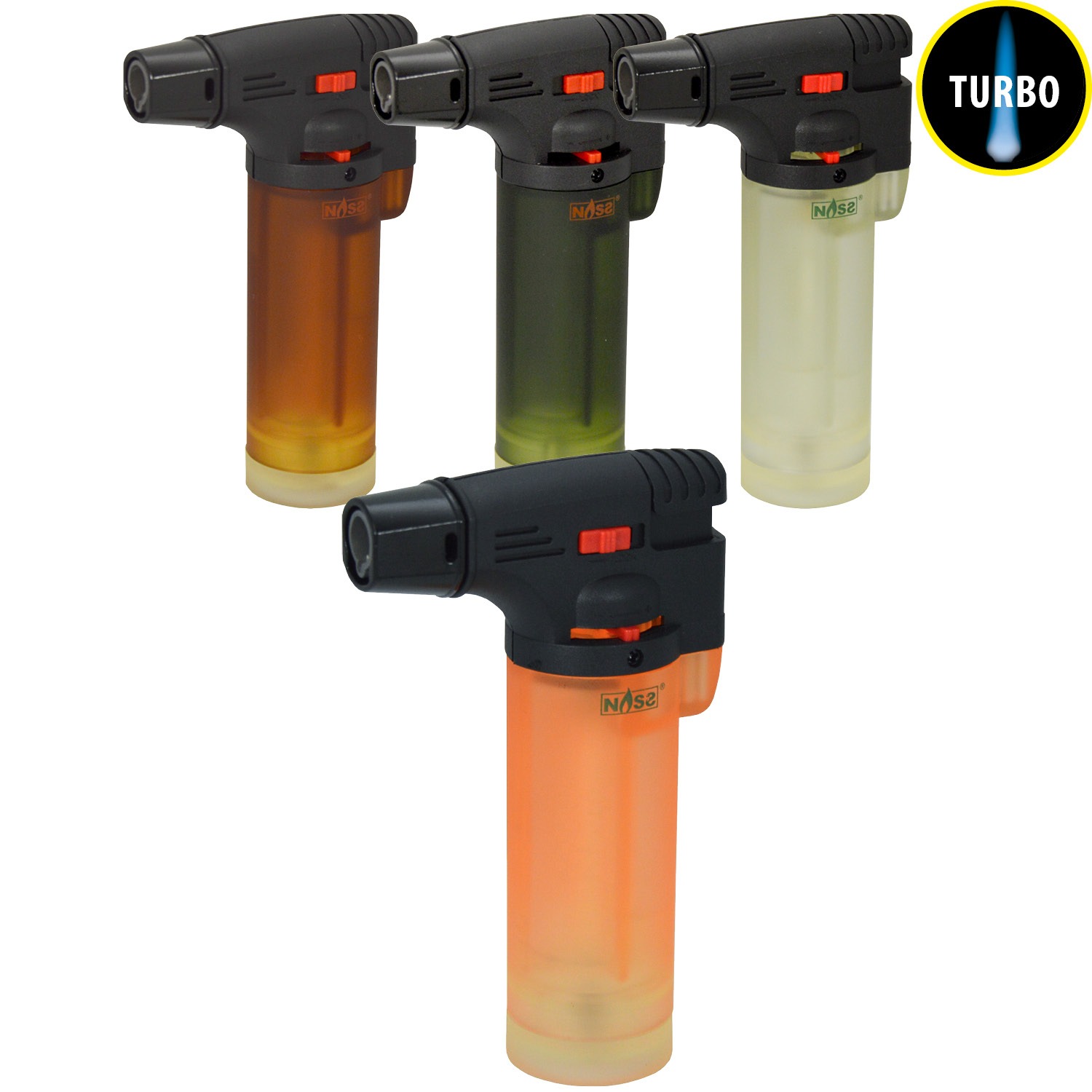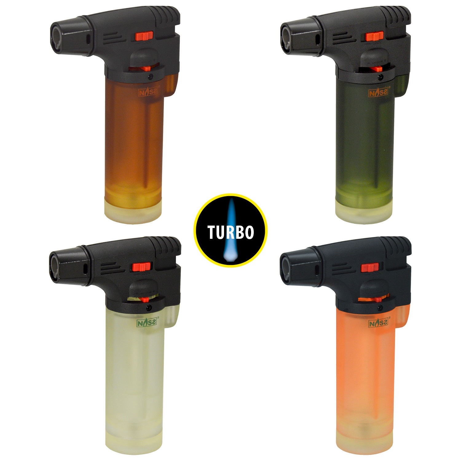 Grote, transparante aansteker met blauwe jetvlam. Verkrijgbaar in 4 verschillende kleuren, verpakt in een display van 12 stuks.