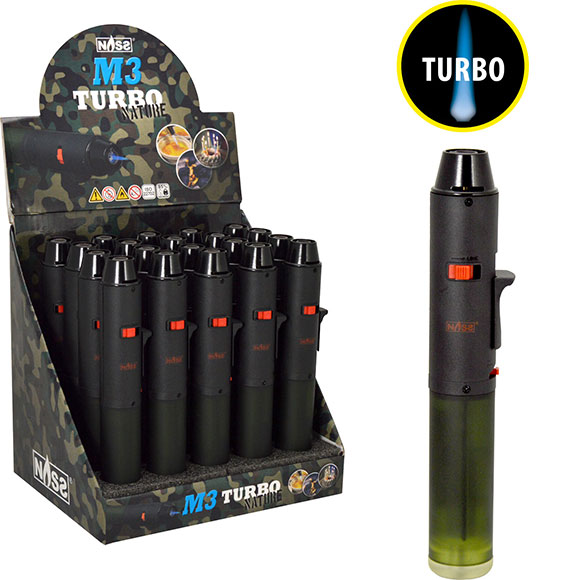 Grote aansteker met een blauwe jetvlam in donker khaki. 20 stuks gesorteerd in een display. Navulbaar.