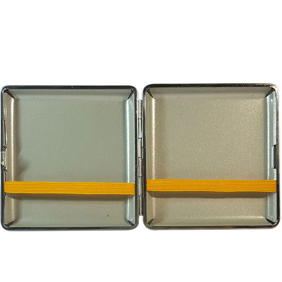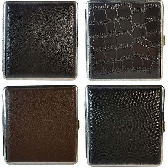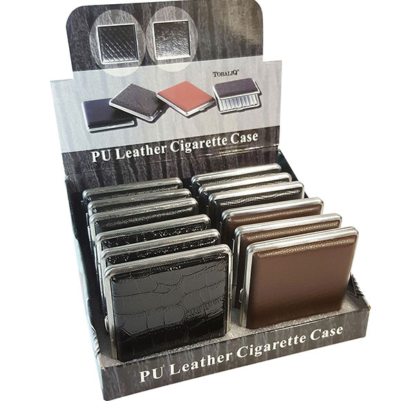 Het sigarettenetui met lederlook heeft aan de binnenkant een elastiek voor het vasthouden van de sigaretten. Het sigarettenetui is gesorteerd in verschillende kleuren en ontwerpen in een display van 12 stuks. Met een capaciteit van maximaal 20 filter sigaretten.